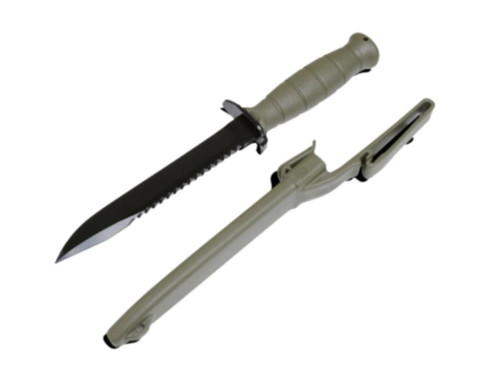 This saw back survival knife is an ideal addition to any tool kit, field pack or belt. It features a tough 6 1/2 inch carbon steel clip point blade and molded polymer hilt, tough enough to break windows or cut through the toughest tree limb, yet perfectly balanced for appropriate conditions. The one-piece polymer sheath is ideal for keeping the 3/16 inch blade protected. The set includes an integral retention system to keep your Glock knife secure during times of extreme activity.