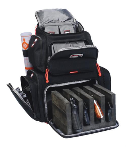G.P.S. WILD ABOUT SHOOTING. The Handgunner Backpack. This new “free standing” backpack allows for hands free transportation to and from the range. Our new “Handgunner Backpack” was designed to allow the avid Handgun shooter a way to transport his Handguns, 12 Extra Magazines, Ammo, Shooting Glasses, Ear Protection, Targets, Stapler, Tape, Binos, Shooting mats, Cleaning Supplies all in a compact Backpack. By utilizing our Visual ID Storage System we have designed separate pockets that store your most frequently used items for added protection and easy retrieval. The most unique feature is the inside Storage Cradle that slides in and out of the lower compartment. This foam cradle was designed to hold 4 medium to small size handguns in a VERTICAL format. This Vertical format allows for ease of use at the range and added protection from 360 degrees. This Cradle is made of high density foam and is cut with a CNC machine to cradle each pistol by its trigger guard. Just slide out the cradle at the range and keep all 4 pistols organized. After shooting, remove the cradle with the handguns inside for cleaning and then for storage in your gun safe. No need to open and close pistol cases or rugs each time you intend to use. The “Handgunner” backpack also features a waterproof pull out cover to help keep the contents dry in case of a sudden downpour.. Free standing backpack. Visual ID Storage System. Separate pockets store your most frequently used items for added protection and easy retrieval. Inside Storage Cradle slides in and out of the lower compartment. Foam cradle was designed to hold 4 medium to small size handguns in a vertical format. Cradle is made of high density foam and is cut with a CNC machine to cradle each pistol by its trigger guard.. Features a waterproof pull-out cover to help keep the contents dry.. Black.. Category. :. Carrying Bags. Type. :. Backpack. Airline Approved. :. Yes. Material. :. Nylon. Color. :. Black. Hardware. :. Internal Organization System. Lockable. :. Yes. Proofs. :. Waterproof