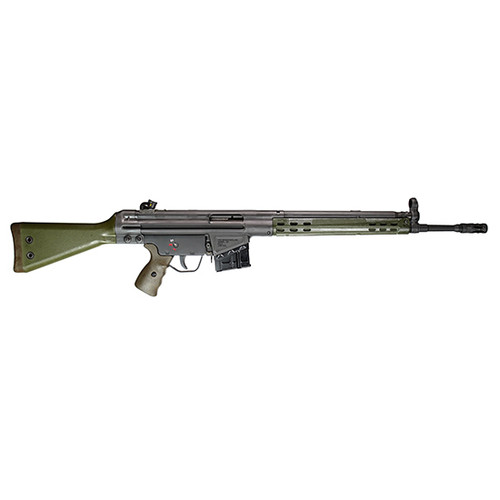 NJ compliant PTR GI w/ 10 round magazine. The GI rifle features a Parkerized finish with classic green furniture, 18″ tapered barrel and a classic “SEF” steel lower. The removal of the precision-welded top rail allows the use of original claw mounts and carry handles.. All furniture has an NRA quality rating of GOOD- In safe working condition, minor wear on working surfaces, no broken parts, no corrosion or pitting that will interfere with proper functioning.. OAL. :. 40.5″. Barrel. :. 18″. Weight. :. 9.5 lbs. Operating Systems. :. Roller-delayed blowback. Caliber. :. .308 (also accepts 7.62 x 51). Action. :. SEMI-AUTOMATIC. Twist. :. 1/10. Trigger Pull. :. 9-10 lbs. Magazine. :. 10 round