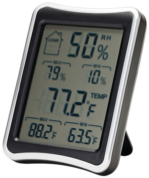 Ensure the best environment for guns, accessories and other valuables in your safe or vault room. Displays current temperature and humidity and recent extremes in Fahrenheit or Celsius. Large LCD display. Fold-out stand for storage on shelf or floor. Powered by two AAA batteries (not included).. Description. :. SnapSafe Hygrometer. Made In The USA. :. Made In The USA. Catalog Vendor Name. :. SNAPSAFE