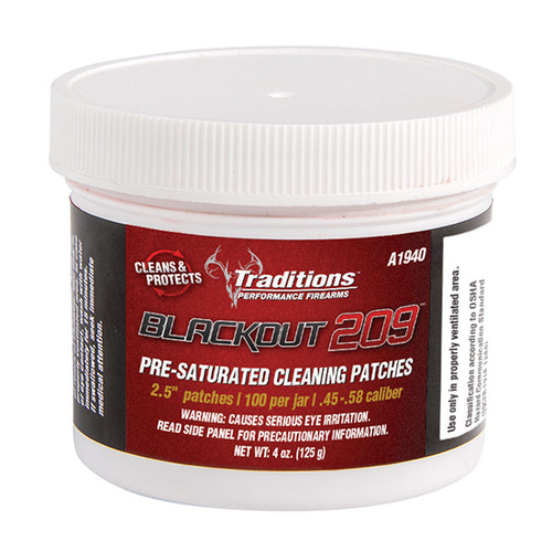 Traditions new BlackOut 209 is an advanced formula that helps clean fouling from your muzzleloader when using BlackHorn 209 Powder. The all-in-one oil based cleaner helps reduce fouling and treats the barrel to help protect against rust.. Material. :. Cotton. Model. :. Blackout. Quantity. :. 100 Per Pkg