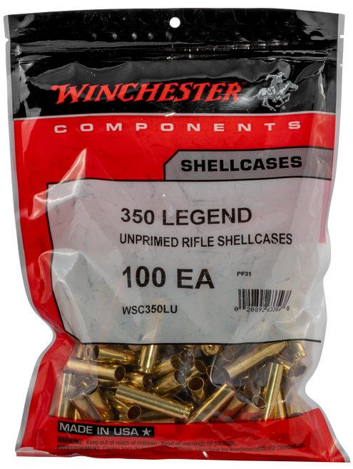 Shellcases for rifles are engineered to precise tolerances to ensure smooth-feeding and positive chambering.. Material. :. Brass. Caliber or Gauge. :. 350 Legend. Quantity. :. 100